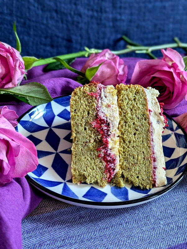 This really is a stand out cake. Definitely one to savour rather than snarf. This lovely sponge, with its subtle green hue, is so soft and satisfying. And the raspberry-lemony-creamy-vanilla-rey flavour combo is sheer heaven on a stick.